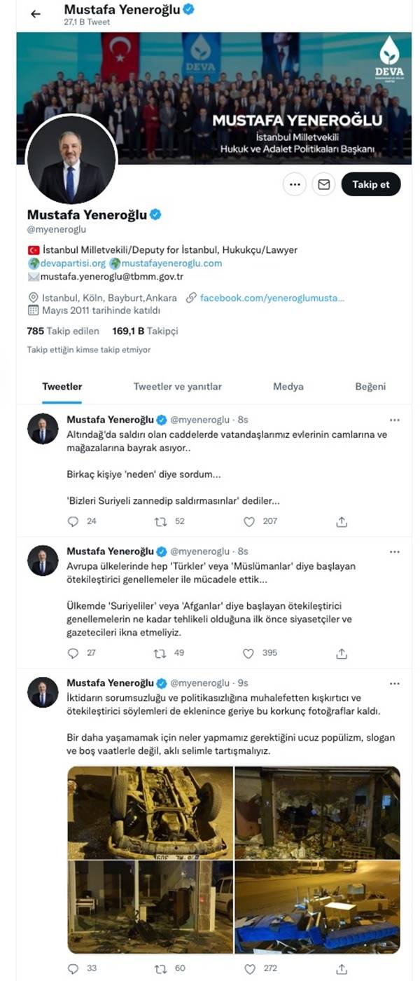 AK Parti'den istifa edip DEVA Partisi'ni kuranlar arasında yer alan Mustafa Yeneroğlu muhalefetin Suriyelilere yönelik kışkırtıcı diline sonunda itiraz etti. Ancak sırf muhalefet etmek adına önce Emniyet'e saydıran Yeneroğlu, güvenlik güçlerinin olayları kontrol altına almasının ardından ağız değiştirdi. Muhalefetin kışkırtmalarına rağmen Emnriyet'in olaylara hakim olduğunu itiraf etmek zorunda kalan Yeneroğlu, korkunç bir facianın eşiğinden dönüldüğünü açıkladı.