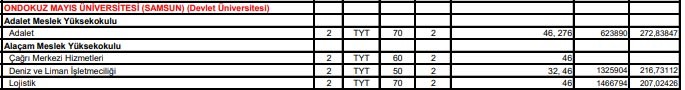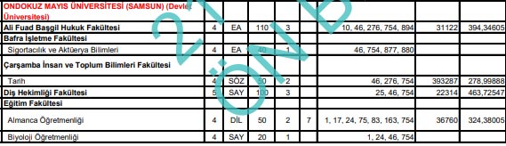 Ondokuz Mayıs Üniversitesi 2020 taban puanları başarı sıralamaları 2 yıllık