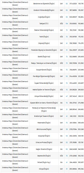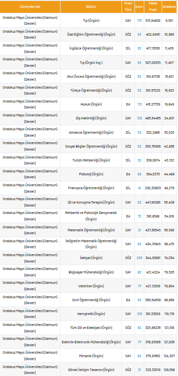 Taban puanları, üniversite adaylarının almış oldukları puanlar ile hangi üniversitelerin, hangi bölümlerine gireceklerini belirleyen puan türlerine verile isimdir. Peki, Ondokuz Mayıs Üniversitesi taban puanı, en düşük yüzdelik, en yüksek yüzdelik ve kontenjan sayıları kaçtır?