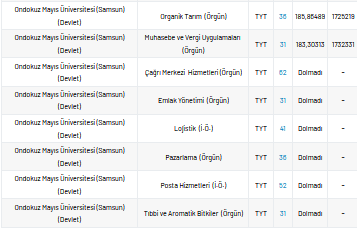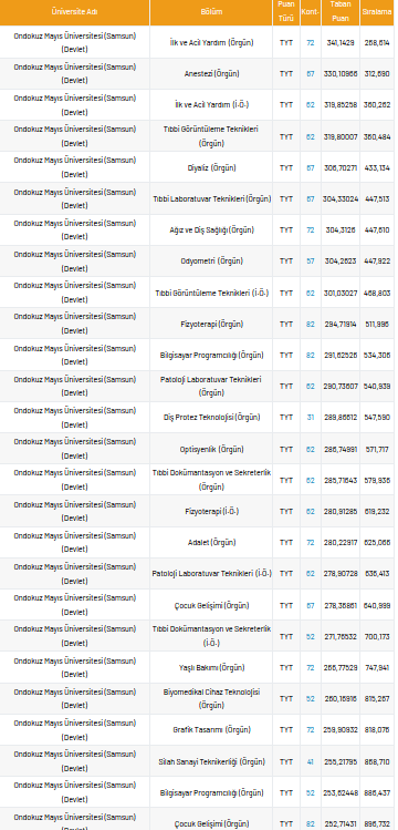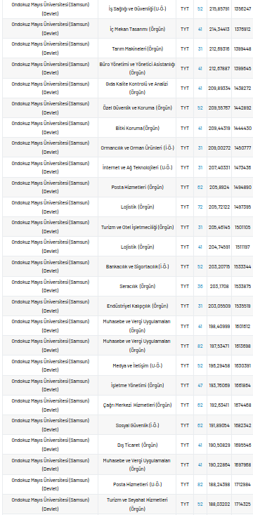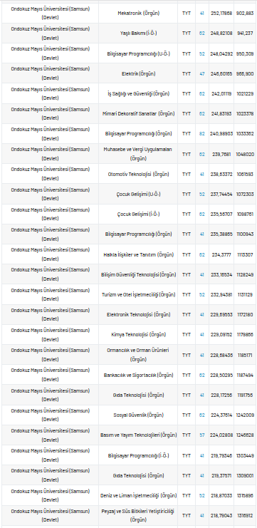 Ondokuz Mayıs Üniversitesi 2 yıllık taban puanları 2021, yüzdelik dilimleri ve kontenjan sayıları kaçtır?