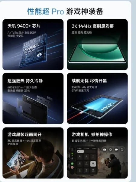 Tablet, MediaTek Dimensity 9400+ işlemciyle güçlendirilmiş durumda ve AnTuTu testinde 3,05 milyon puan aldı. 46.000 mm²’yi aşan buhar soğutma sistemi sayesinde ısınma sorunu minimize ediliyor. 5,99 mm kalınlığındaki cihaz 579 gram ağırlığında.