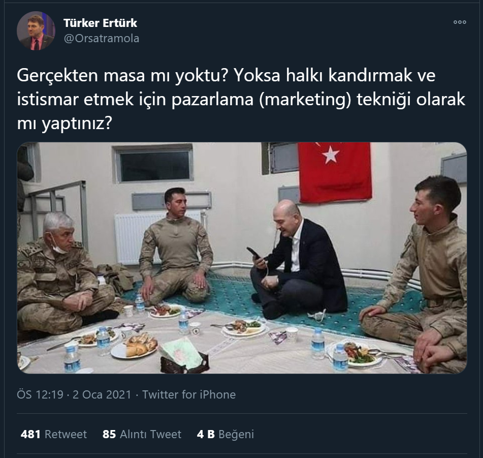 Askerlerin ve Bakan Soylu heyetindeki herkesin sığabilmesi için yere serilen bir sofrada yemek yenmesini eleştiren Türker Ertürk, Mehmetçiklerin de Bakan Soylu’nun reklamını yapmaya çalıştığını ileri sürerek haddini aştı.