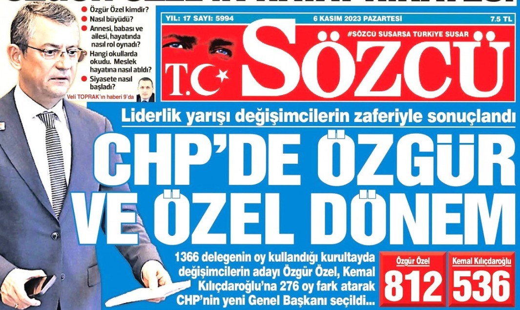 Gazete bugünkü manşetinde, "CHP'de Özgür ve Özel Dönem" başlığını kullandı. Sözcü'nün manşeti, "Kılıçdaroğlu yasakçı mıydı?" sorusunu gündeme getirdi.