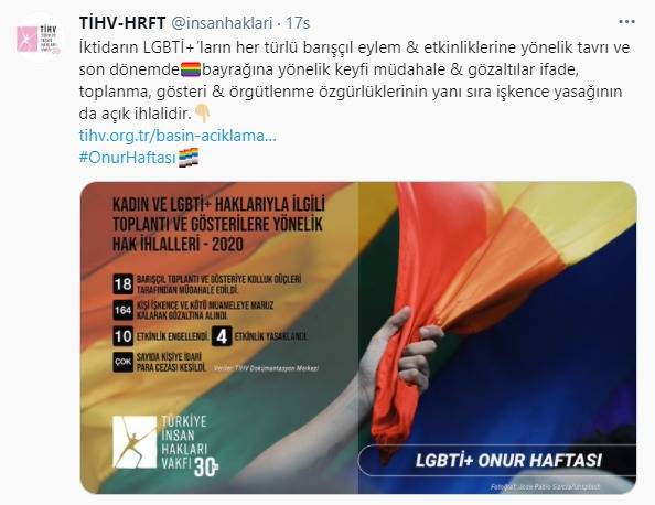 LGBTİ sapkınlarının avukatlığına soyunan Türkiye İnsan Hakları Vakfı, yaptığı paylaşımda, “Cinsel yönelim ve cinsiyet kimliğine dayalı ayrımcılık, Avrupa İnsan Hakları Mahkemesi’nin pek çok kararında vurguladığı üzere Avrupa İnsan Hakları Sözleşmesi’nin diğer pek çok maddesinin yanı sıra işkence yasağı başlıklı üçüncü maddesinin de ihlaline sebep verir. Siyasi iktidarın bu anlamda başta 2015’ten beri İstanbul LGBTİ+ Onur Yürüyüşüne olmak üzere Türkiye’nin çeşitli illerinde uzun yıllardır LGBTİ+’ların her türlü barışçıl eylem ve etkinliklerine yönelik tavrı ve özellikle son zamanlarda gökkuşağı bayrağına yönelik keyfi müdahale ve gözaltılar ifade, toplanma, gösteri ve örgütlenme özgürlüklerinin yanı sıra işkence yasağının da açık ihlalidir. TİHV Dokümantasyon Merkezi’nin tespitlerine göre sadece 2020 yılında kadınlar ve LGBTİ+’lar tarafından yapılmak istenen en az 18 toplantı ve gösteriye kolluk güçlerinin müdahalesi sonucu en az 164 kişi işkence ve kötü muameleye maruz kalarak gözaltına alınmıştır. LGBTİ+ Onur Haftası kutlu olsun” ifadelerine yer verdi.