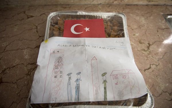Yemek hazırlarken annelerine destek olan çocuklardan birinin yazdığı, yemek paketlerinden birinin üzerine iliştirilen, "Allah'ım babamı ve sizi korusun. Allah'ım polis abilerimi aslanlardan, kaplanlardan ve kötü insanlardan koru" yazılı not herkesi duygulandırdı.