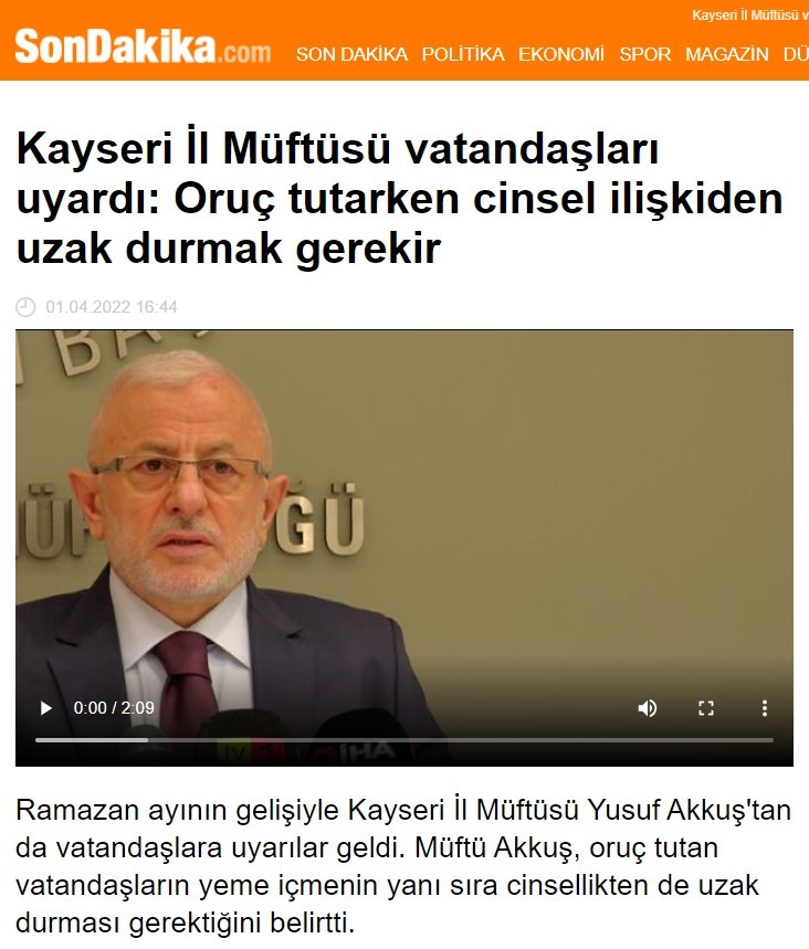 "Şehvet" hissini uyandırmaktan kaçınılması gerektiğini belirten Kayseri İl Müftüsü Yusuf Akkuş'un "cinsellikten uzak durun" ifadesini çarpıtan Sondakika, "oruç tutarken cinsel ilişkiden uzak durulması gerekir" başlığı attı.