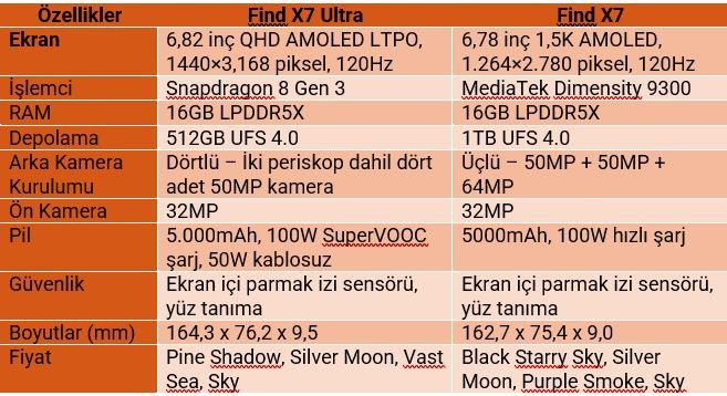 Find X7 serisi, kutudan Android 14 tabanlı ColorOS 14 ile çıkıyor. Serideki standart model, MediaTek Dimensity 9300 işlemcisini kullanırken Ultra ise Snapdragon 8 Gen 3’ten güç alıyor. Black Starry Sky, Silver Moon, Purple Smoke, Sky renk seçenekleriyle sunulacak Oppo Find X7 serisi fiyatlandırması ise X7 için 570 dolar ve X7 Ultra için 870 dolardan başlıyor.