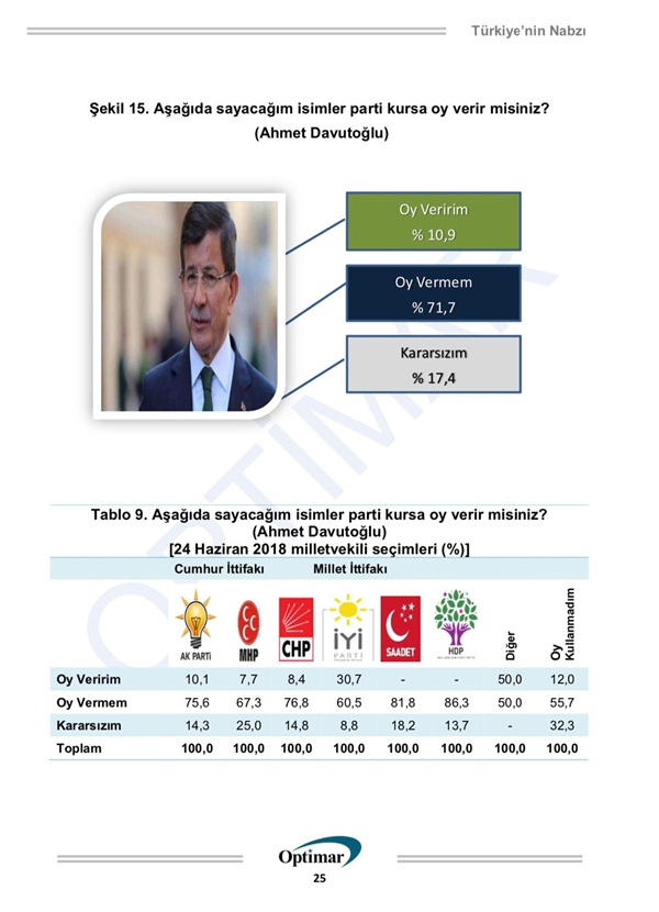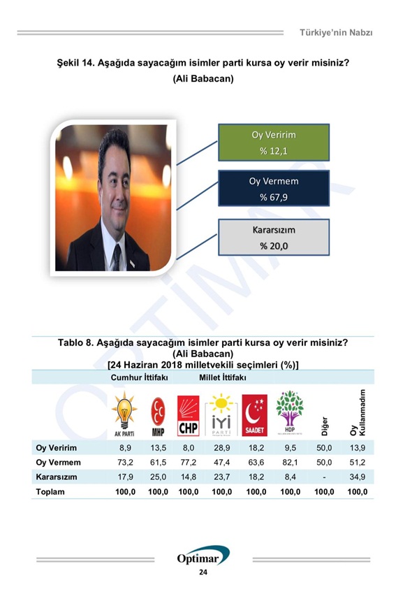 Optimar araştırma şirketinin hazırladığı ankete katılan kişilere yeni parti kurulması durumunda kime oy verecekleri soruldu. Katılımcıların yüzde 12.1’i Ali Babacan'a, yüzde 10.9’u Ahmet Davutoğlu'na "oy veririm" dedi.