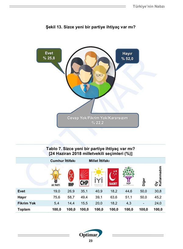 "Sizce yeni bir partiye ihtiyaç var mı?" sorusuna katılımcıların yüzde 52'si "hayır", yüzde 25.8’i "evet",yüzde 22.2 si de "fikrim yok" yanıtını verdi.