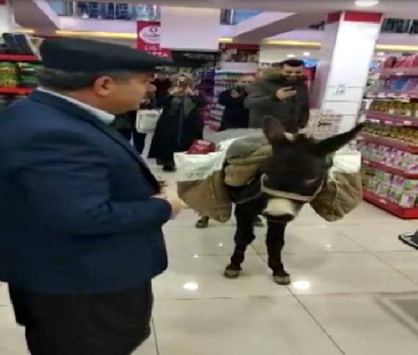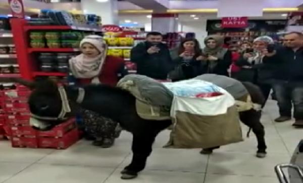 Niğde’de 1'i kadın, diğeri erkek 2 kişi, paralı poşet uygulamasını protesto etmek için markete eşekle geldi. Eşekle markete girip reyonları dolaşan 2 kişi, aldıkları ürünleri hayvanın heybesine koyduktan sonra çıkıp gitti.