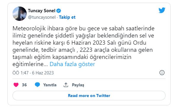 Ordu Valisi Tuncay Sonel, sosyal medya hesabından yaptığı paylaşımda, "Meteorolojik ihbara göre bu gece ve sabah saatlerinde ilimiz genelinde şiddetli yağışlar beklendiğinden sel ve heyelan riskine karşı 6 Haziran 2023 Salı günü Ordu genelinde tedbir amaçlı, 2 bin 223 araçla okullarına gelen taşımalı eğitim kapsamındaki öğrencilerimizin eğitimlerine bir gün süreyle ara veriyoruz. Rabbim ülkemizi ve milletimizi tüm afetlerden korusun" ifadelerine yer verdi.