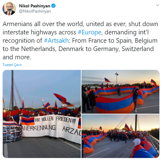 Paşinyan, Twitter hesabından yaptığı paylaşımda, "Dünyadaki tüm Ermeniler, Avrupa genelinde tün eyaletler arası yolları kapatarak Karabağ'ın tanınmasını talep ettiler. 2018 yılında Ermeniler demokratik hakları için dik durdular. Bugün tüm dünyadaki Ermeniler, Karabağ halkının kendi kararını verme hakkı için birleştiler" ifadelerini kullandı.