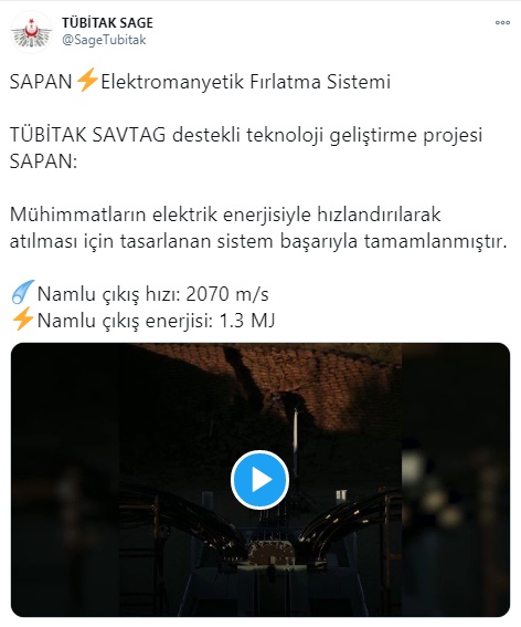 TÜBİTAK SAGE, Elektromanyetik Fırlatma Sistemi SAPAN'ın başarıyla tamamlandığını duyurdu. TÜBİTAK SAGE'nin sosyal medya hesabından yapılan videolu paylaşımda, "TÜBİTAK SAVTAG destekli teknoloji geliştirme projesi SAPAN: Mühimmatların elektrik enerjisiyle hızlandırılarak atılması için tasarlanan sistem başarıyla tamamlanmıştır. Namlu çıkış hızı: 2070 m/s Namlu çıkış enerjisi: 1.3 MJ" ifadelerine yer verildi.