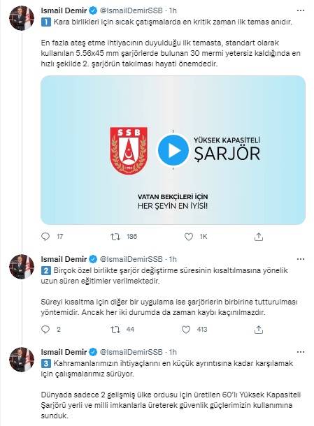 Demir, süreyi kısaltmak için diğer bir uygulamanın ise şarjörlerin birbirine tutturulması olduğunu ancak her iki durumda da zaman kaybının kaçınılmaz olduğunu dile getirdi. İsmail Demir, "Kahramanlarımızın ihtiyaçlarını en küçük ayrıntısına kadar karşılamak için çalışmalarımız sürüyor. Dünyada sadece 2 gelişmiş ülke ordusu için üretilen 60'lı yüksek kapasiteli şarjörü yerli ve milli imkanlarla üreterek güvenlik güçlerimizin kullanımına sunduk" dedi.