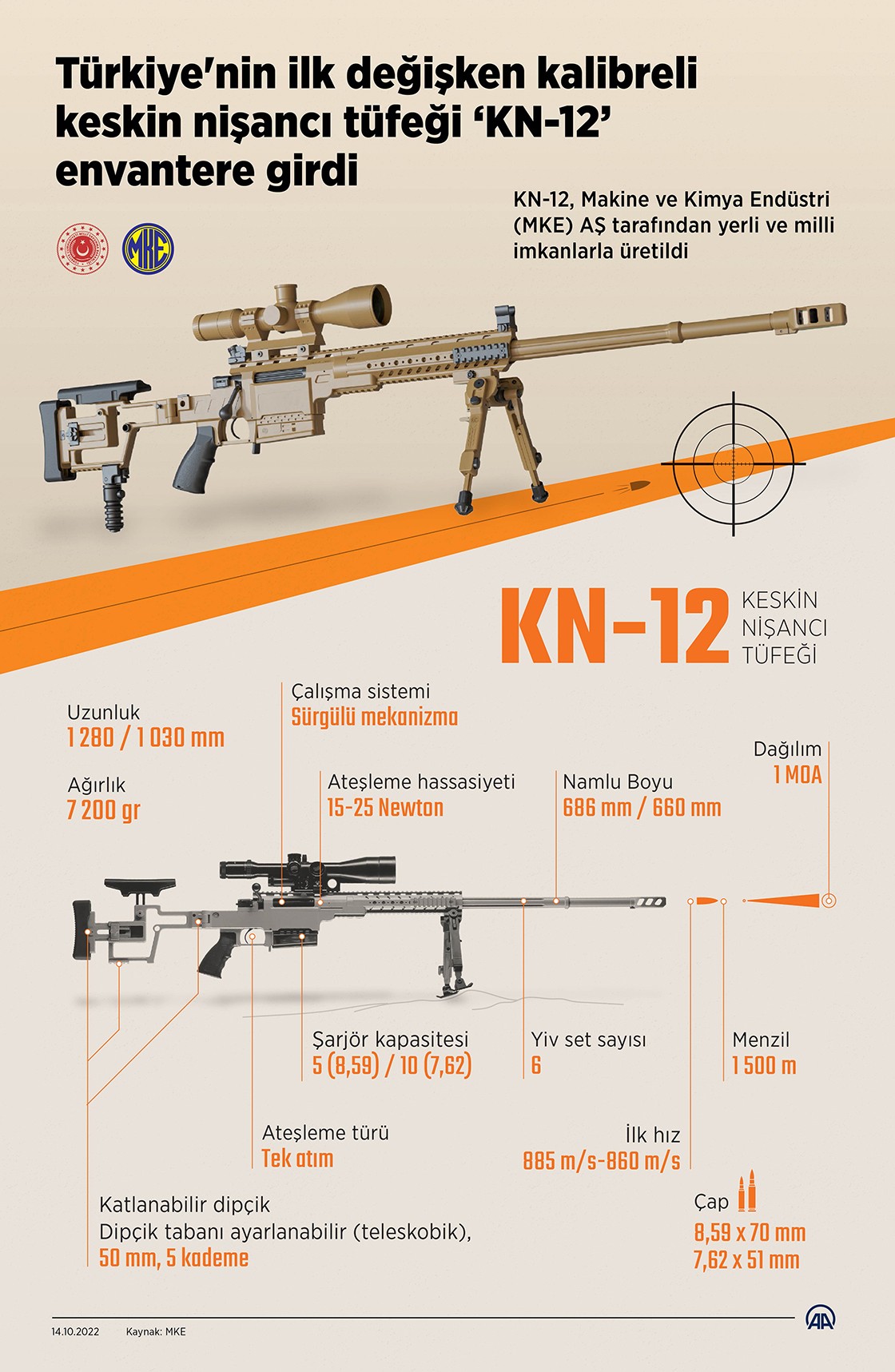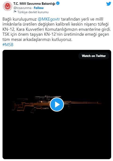 Milli Savunma Bakanlığının sosyal medya hesabından yapılan açıklamada, "Bağlı kuruluşumuz MKE tarafından yerli ve milli imkanlarla üretilen değişken kalibreli keskin nişancı tüfeği KN-12, Kara Kuvvetleri Komutanlığımızın envanterine girdi. TSK için önem taşıyan KN-12'nin üretiminde emeği geçen tüm mesai arkadaşlarımızı kutluyoruz" ifadelerine yer verildi.