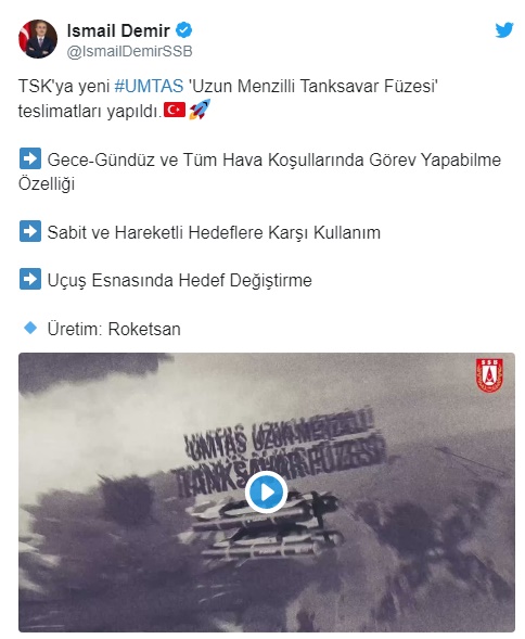 Savunma Sanayi Başkanı İsmail Demir Twitter hesabından yaptığı paylaşımda "TSK'ya yeni #UMTAS 'Uzun Menzilli Tanksavar Füzesi' teslimatları yapıldı" ifadelerini kullandı.