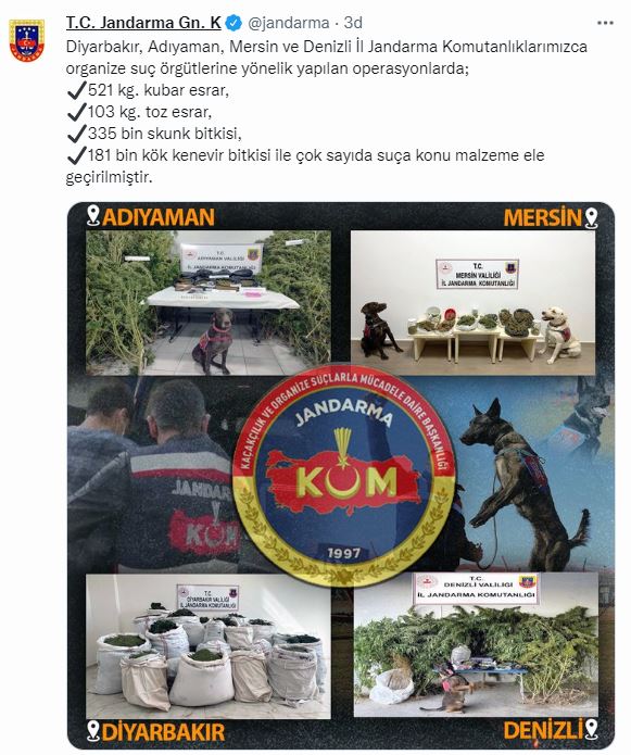 Jandarma Genel Komutanlığı sosyal medya hesabı üzerinden yapılan paylaşımda, “Diyarbakır, Adıyaman, Mersin ve Denizli İl Jandarma Komutanlıklarımızca organize suç örgütlerine yönelik yapılan operasyonlarda; 521 kg. kubar esrar, 103 kg. toz esrar, 335 bin skunk bitkisi, 181 bin kök kenevir bitkisi ile çok sayıda suça konu malzeme ele geçirilmiştir” ifadeleri kullanıldı.