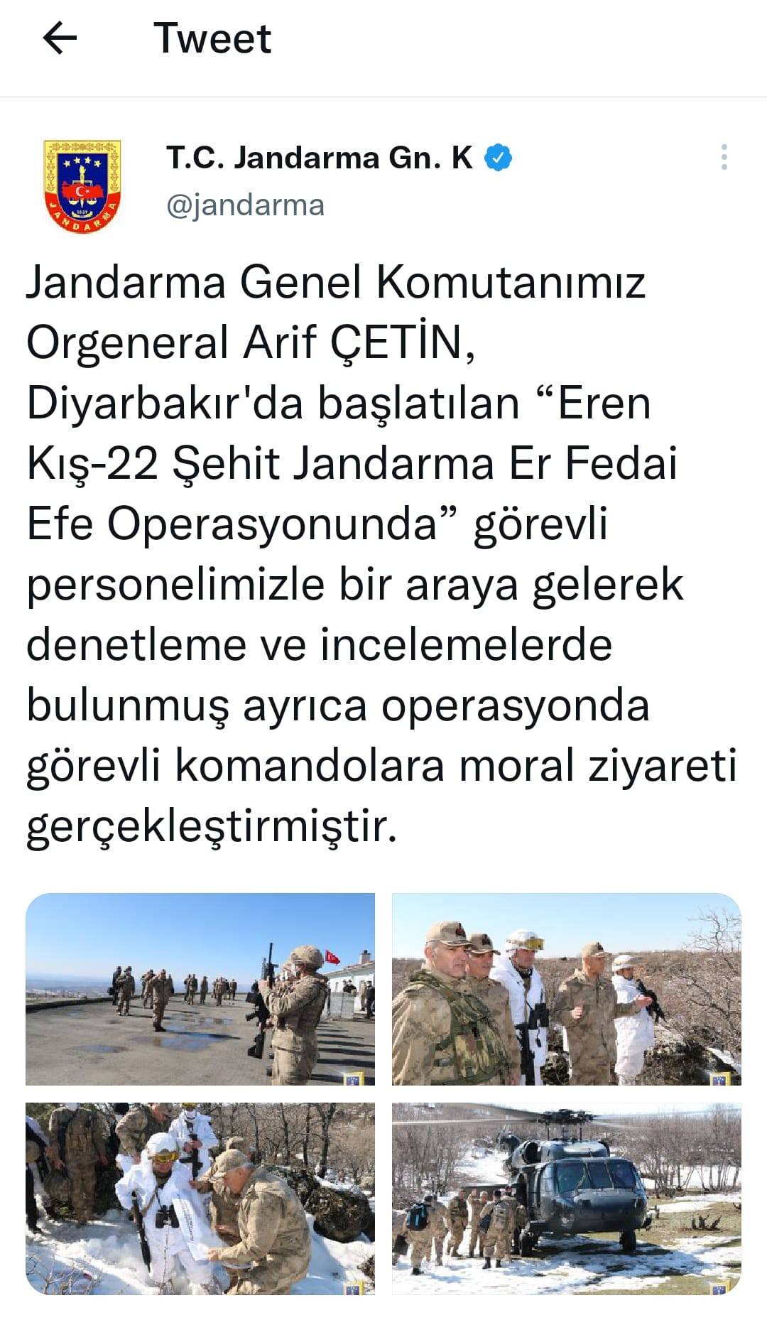 Açıklamada şu ifadelere yer verildi; " Jandarma Genel Komutanımız Orgeneral Arif ÇETİN, Diyarbakır'da başlatılan “Eren Kış-22 Şehit Jandarma Er Fedai Efe Operasyonunda” görevli personelimizle bir araya gelerek denetleme ve incelemelerde bulunmuş ayrıca operasyonda görevli komandolara moral ziyareti gerçekleştirmiştir"