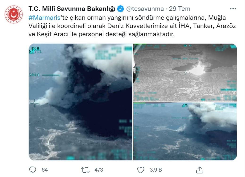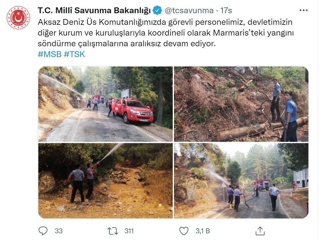 29 Temmuz tarihinde resmi Twitter hesabından bir paylaşım yapan Milli Savunma Bakanlığı, Marmaris'te çıkan orman yangınını söndürme çalışmalarına Deniz Kuvvetleri Komutanlığı'na ait İHA, tanker, arazöz ve keşif araçları ile birlikte personel desteği sağlandığını bildirdi.