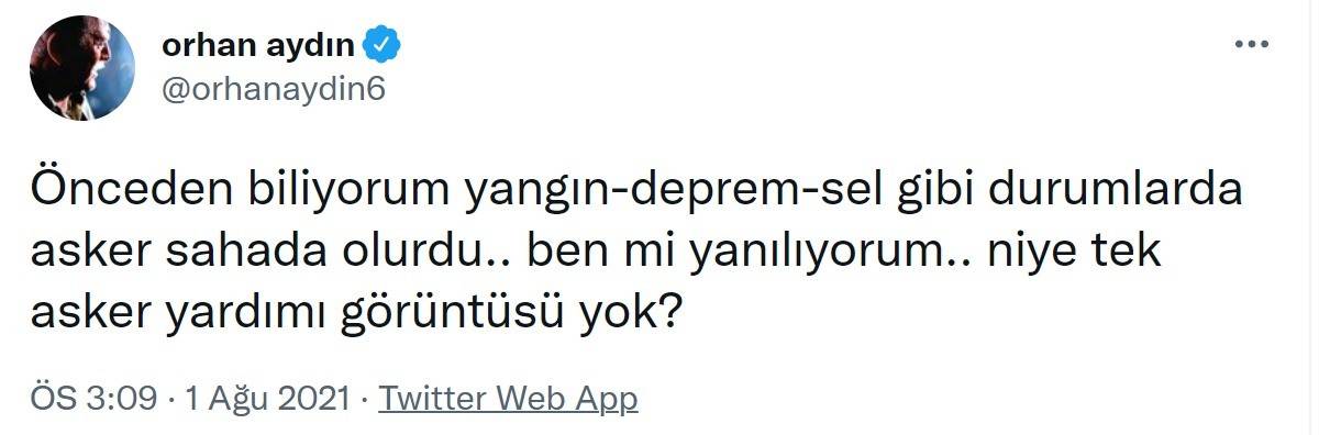 Yangın çalışmalarına askerlerin katılmadığını iddia eden Orhan Aydın sosyal medya hesabından yaptığı paylaşımda, "Önceden biliyorum yangın-deprem-sel gibi durumlarda asker sahada olurdu... Ben mi yanılıyorum... Niye tek asker yardımı görüntüsü yok?" ifadelerini kullandı.