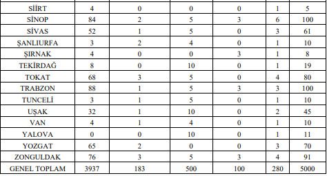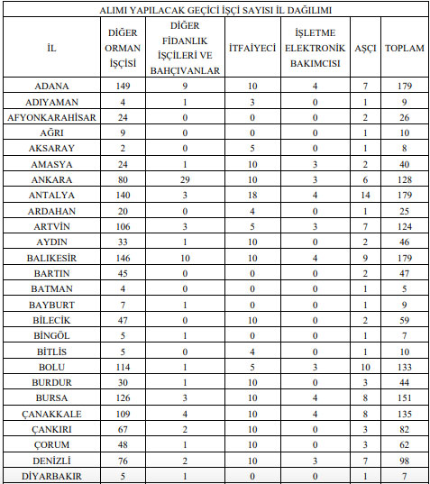Orman Genel Müdürlüğü taşra teşkilatında istihdam edilmek üzere Diğer Orman İşçisi pozisyonunda 3937, İtfaiyeci pozisyonunda 500, Aşçı pozisyonunda 280, Diğer Fidanlık İşçileri ve Bahçıvanlar pozisyonunda 183 ve İşletme Elektronik Bakımcısı pozisyonunda 100 olmak üzere toplamda 5000 Geçici İşçi alımı yapılacaktır.