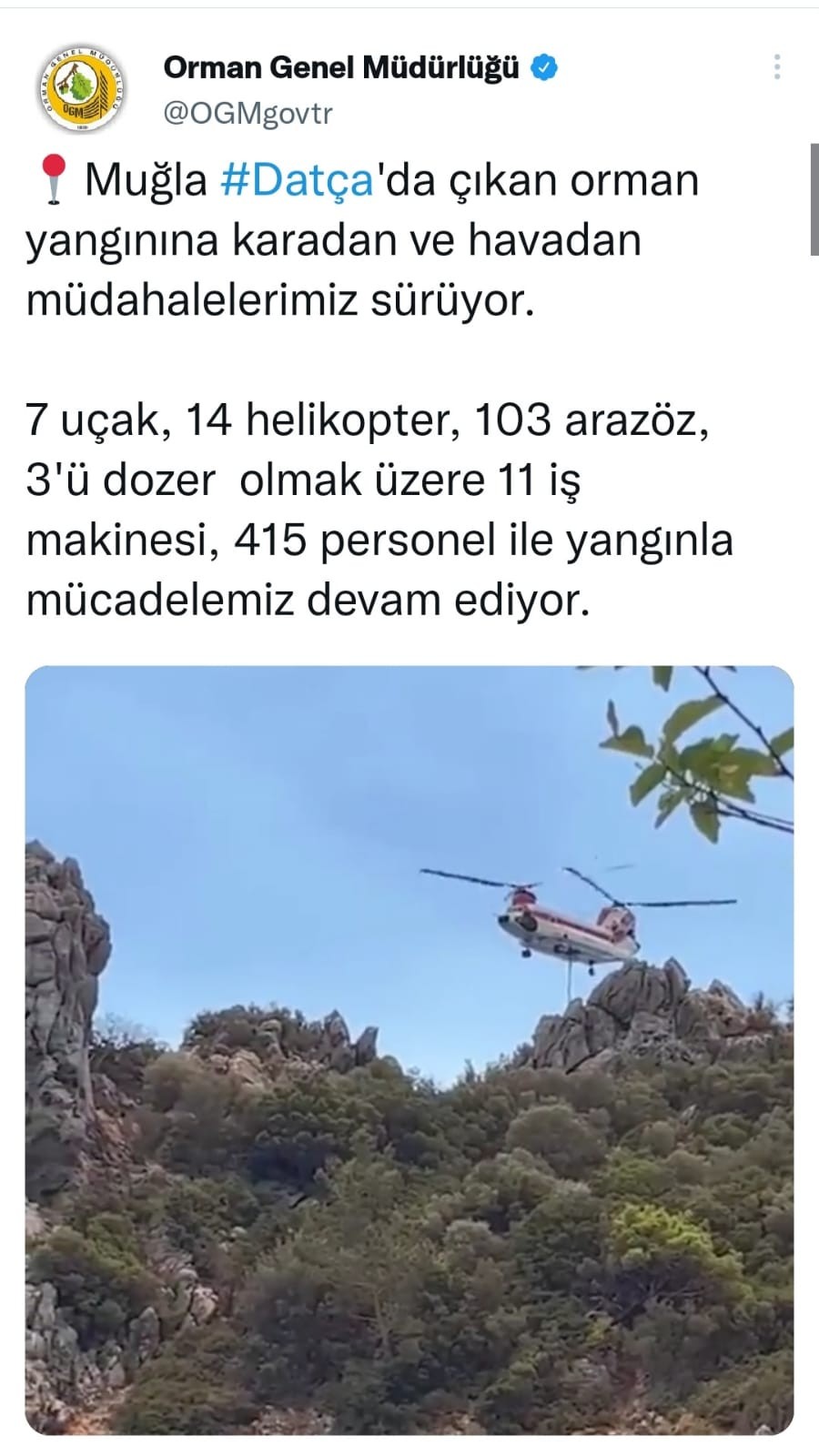 Vatandaşlara yangın bölgesinde bulunan yollarda trafik oluşturacak hareketlerden kaçınılması uyarısı yapan Orman Genel Müdürlüğü, "Muğla #Datça'da çıkan orman yangınına karadan ve havadan müdahalelerimiz sürüyor. 7 uçak, 14 helikopter, 103 arazöz, 3'ü dozer olmak üzere 11 iş makinesi, 415 personel ile yangınla mücadelemiz devam ediyor. Yangının durumu anlık olarak İHA görüntüleri ile yangın yönetim merkezimize aktarılıyor. Bölgede bulunan hava ve kara araçları yangının ilerleyişine göre cephelere sevk edilmeye devam ediliyor. Lütfen yangın bölgesinde bulunan yollarda trafik oluşturacak hareketlerden kaçının!" ifadelerini kullandı.