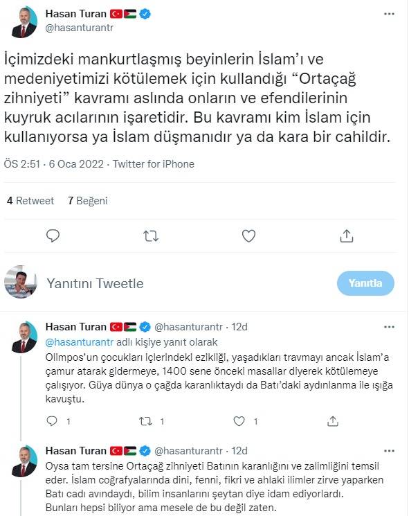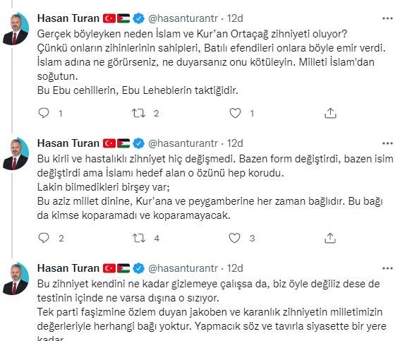 CHP Grup Başkanvekili Özgür Özel, Diyanet İşleri Başkanlığı'nın okul öncesi Kur'an kursları için skandal ifadeler kullanarak bu kurslar için “Ortaçağ zihniyeti” ifadelerine AK Parti İstanbul Milletvekili Hasan Turan’dan tepki geldi. Turan sosyal medya hesabından yaptığı paylaşımlarda, “İçimizdeki mankurtlaşmış beyinlerin İslam’ı ve medeniyetimizi kötülemek için kullandığı “Ortaçağ zihniyeti” kavramı aslında onların ve efendilerinin kuyruk acılarının işaretidir. Bu kavramı kim İslam için kullanıyorsa ya İslam düşmanıdır ya da kara bir cahildir. Olimpos’un çocukları içlerindeki ezikliği, yaşadıkları travmayı ancak İslam’a çamur atarak gidermeye, 1400 sene önceki masallar diyerek kötülemeye çalışıyor. Güya dünya o çağda karanlıktaydı da Batı’daki aydınlanma ile ışığa kavuştu. Oysa tam tersine Ortaçağ zihniyeti Batının karanlığını ve zalimliğini temsil eder. İslam coğrafyalarında dini, fenni, fikri ve ahlaki ilimler zirve yaparken Batı cadı avındaydı, bilim insanlarını şeytan diye idam ediyorlardı. Bunları hepsi biliyor ama mesele de bu değil zaten. Gerçek böyleyken neden İslam ve Kur’an Ortaçağ zihniyeti oluyor? Çünkü onların zihinlerinin sahipleri, Batılı efendileri onlara böyle emir verdi. İslam adına ne görürseniz, ne duyarsanız onu kötüleyin. Milleti İslam'dan soğutun. Bu Ebu cehillerin, Ebu Leheblerin taktiğidir. Bu kirli ve hastalıklı zihniyet hiç değişmedi. Bazen form değiştirdi, bazen isim değiştirdi ama İslamı hedef alan o özünü hep korudu. Lakin bilmedikleri bir şey var; Bu aziz millet dinine, Kur'ana ve peygamberine her zaman bağlıdır. Bu bağı da kimse koparamadı ve koparamayacak. Bu zihniyet kendini ne kadar gizlemeye çalışsa da, biz öyle değiliz dese de testinin içinde ne varsa dışına o sızıyor. Tek parti faşizmine özlem duyan jakoben ve karanlık zihniyetin milletimizin değerleriyle herhangi bağı yoktur. Yapmacık söz ve tavırla siyasette bir yere kadar” ifadelerini kullandı.
