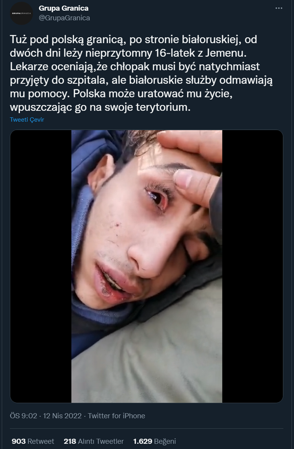 Polonya’da sığınmacılara yardım için çalışan “Grupa Granica” (Sınır Grubu) aktivistleri, Belarus sınır hattında aylardır derme çatma yaşayan düzensiz göçmenlerin görüntülerini paylaşıyor. Hamile kadınlar, çocuklar, engelli erkekler tam bir sefalet içinde. Mesela Belarus tarafında baygın yatarken bulunan 16 yaşındaki Yemenli çocuğun görüntüsü…