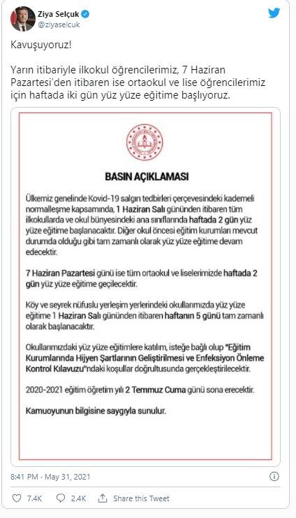 Milli Eğitim Bakanı Ziya Selçuk, "Yarın itibarıyla ilkokul öğrencilerimiz, 7 Haziran Pazartesi itibarıyla ortaokul ve lise öğrencilerimiz için haftada iki gün yüz yüze eğitime başlıyoruz" dedi.