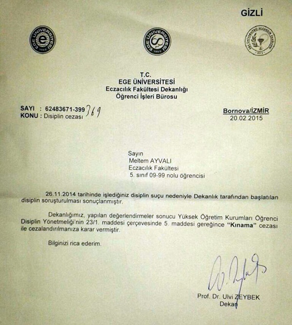 Rektörü istifaya çağıran TGB İzmir İl Başkanı Meltem Ayvalı soruşturma sonunda disiplin suçu işlediği gerekçesiyle kınama cezası aldı. oda tv'nin haberine göre, cezanın açıklanmasından sonra konuşan Ayvalı,''Rennan hocaya destek vermek için düzenlediğimiz basın açıklamasında hocamıza kurulan kumpasa ortak olduğunu belgelerle açıkladığımız Ege Üniversite Rektörü Candeğer Yılmaz'ı istifaya davet etmiştik. Bu eylemimiz dolayısıyla hakkımda disiplin işlemi başlatılmıştı. Süreç sonuçlandı ve kınama cezası aldım. Rennan hocamızı savunmak laikliği, bilimi, aydınlanmayı ve üniversitemizi savunmaktır'' şeklinde iddialarda bulundu.
