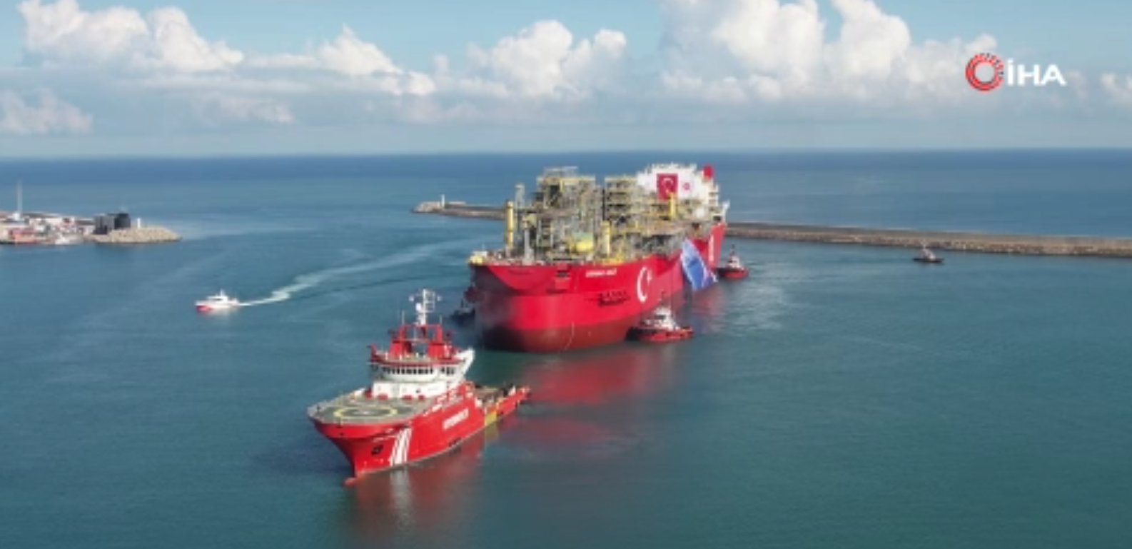 Türkiye'nin ilk yüzer doğal gaz üretim platformu (FPU) Osman Gazi, Filyos limanına girişi dron ile havadan görüntülendi.