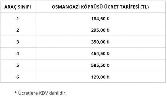 Osmangazi Köprüsü geçiş ücreti 2022 2021 yılında Osmangazi Köprüsü’nden geçiş ücreti 147.5 TL idi, yeni yılla birlikte bu rakam yüzde 25 artarak 184.5 TL oldu.