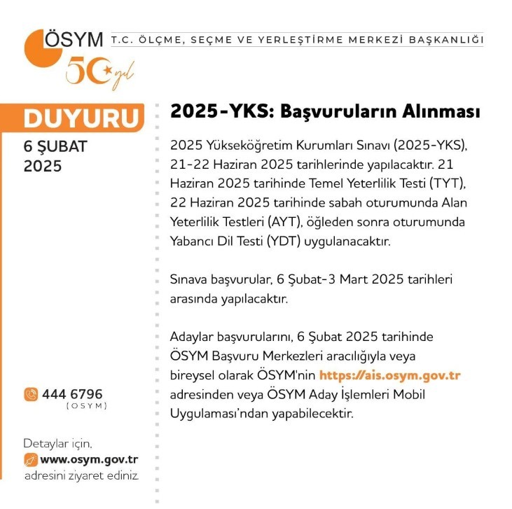 ÖSYM Başkanı Bayram Ali Ersoy, 21-22 Haziran'da yapılacak 2025-Yükseköğretim Kurumları Sınavı (YKS) başvurularının alınmaya başladığını duyurdu.