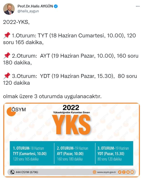 ÖSYM Başkanı Prof. Dr.Halis Aygün 2022 Yüksek Öğretim Kurumları (YKS) sınavının yapılacağı tarihleri resmi sosyal medya hesabı üzerinden açıkladı. Aygün yaptığı paylaşımda, “1.Oturum: TYT (18 Haziran Cumartesi, 10.00), 120 soru 165 dakika, 2.Oturum: AYT (19 Haziran Pazar, 10.00), 160 soru 180 dakika, 3.Oturum: YDT (19 Haziran Pazar, 15.30), 80 soru 120 dakika olmak üzere 3 oturumda uygulanacaktır” ifadelerini kullandı.