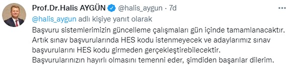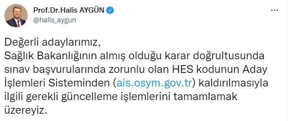 ÖSYM Başkanı Prof. Dr. Halis Aygün sosyal medya hesabı üzerinden dikkat çeken bir açıklamada bulundu. Aygün yaptığı paylaşımda, “Değerli adaylarımız, Sağlık Bakanlığının almış olduğu karar doğrultusunda sınav başvurularında zorunlu olan HES kodunun Aday İşlemleri Sisteminden (http://ais.osym.gov.tr) kaldırılmasıyla ilgili gerekli güncelleme işlemlerini tamamlamak üzereyiz. Başvuru sistemlerimizin güncelleme çalışmaları gün içinde tamamlanacaktır. Artık sınav başvurularında HES kodu istenmeyecek ve adaylarımız sınav başvurularını HES kodu girmeden gerçekleştirebilecektir. Başvurularınızın hayırlı olmasını temenni eder, şimdiden başarılar dilerim” dedi.