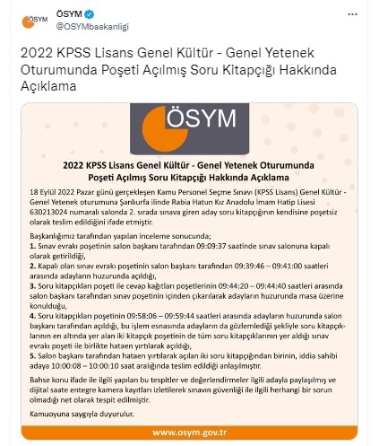 Poşeti açılmış soru kitapçığı hakkında açıklamada bulunan ÖSYM şu ifadelere yer verdi; “18 Eylül 2022 Pazar günü gerçekleşen Kamu Personel Seçme Sınavı (KPSS Lisans) Genel Kültür - Genel Yetenek oturumuna Şanlıurfa ilinde Rabia Hatun Kız Anadolu İmam Hatip Lisesi 630213024 numaralı salonda 2. sırada sınava giren aday soru kitapçığının kendisine poşetsiz olarak teslim edildiğini ifade etmiştir. Başkanlığımız tarafından yapılan inceleme sonucunda; 1. Sınav evrakı poşetinin salon başkanı tarafından 09:09:37 saatinde sınav salonuna kapalı olarak getirildiği, 2. Kapalı olan sınav evrakı poşetinin salon başkanı tarafından 09:39:46 – 09:41:00 saatleri arasında adayların huzurunda açıldığı, 3. Soru kitapçıkları poşeti ile cevap kağıtları poşetlerinin 09:44:20 - 09:44:40 saatleri arasında salon başkanı tarafından sınav poşetinin içinden çıkarılarak adayların huzurunda masa üzerine konulduğu, 4. Soru kitapçıkları poşetinin 09:58:06 - 09:59:44 saatleri arasında adayların huzurunda salon başkanı tarafından açıldığı, bu işlem esnasında adayların da gözlemlediği şekliyle soru kitapçıklarının en altında yer alan iki kitapçık poşetinin de tüm soru kitapçıklarının yer aldığı sınav evrakı poşeti ile birlikte hataen yırtılarak açıldığı, 5. Salon başkanı tarafından hataen yırtılarak açılan iki soru kitapçığından birinin, iddia sahibi adaya 10:00:08 - 10:00:10 saat aralığında teslim edildiği anlaşılmıştır. Bahse konu ifade ile ilgili yapılan bu tespitler ve değerlendirmeler ilgili adayla paylaşılmış ve dijital saate entegre kamera kayıtları izletilerek sınavın güvenliği ile ilgili herhangi bir sorun olmadığı net olarak tespit edilmiştir. Kamuoyuna saygıyla duyurulur.”