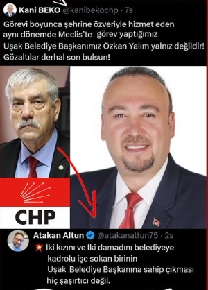 Uşak Belediyesi’nde yaşanan skandallar zinciri, CHP’nin gerçek yüzünü ve liyakatten ne anladığını bir kez daha gözler önüne serdi. "Emeğin ve işçinin" hakkını savunduğunu iddia eden Devrimci İşçi Sendikası (DİSK) Eski Başkanı ve CHP Milletvekili Kani Beko’nun, Uşak Belediye Başkanı Özkan Yalım tarafından "aile boyu" ihya edildiği ortaya çıktı. Belediye, vatandaşa hizmet yerine CHP elitlerinin çocuklarına ve damatlarına kadro açan bir arpalığa dönüştürüldü.