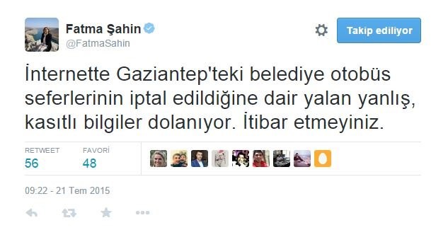 Gaziantep Büyükşehir Belediye Başkanı Fatma Şahin, ildeki belediye otobüsü seferlerinin iptal olduğu yönündeki iddiaların asılsız olduğunu söyledi. Sosyal medyadan açıklama yapan Şahin, "Yalan yanlış, kasıtlı bilgiler dolanıyor. İtibar etmeyiniz" ifadelerini kullandı.