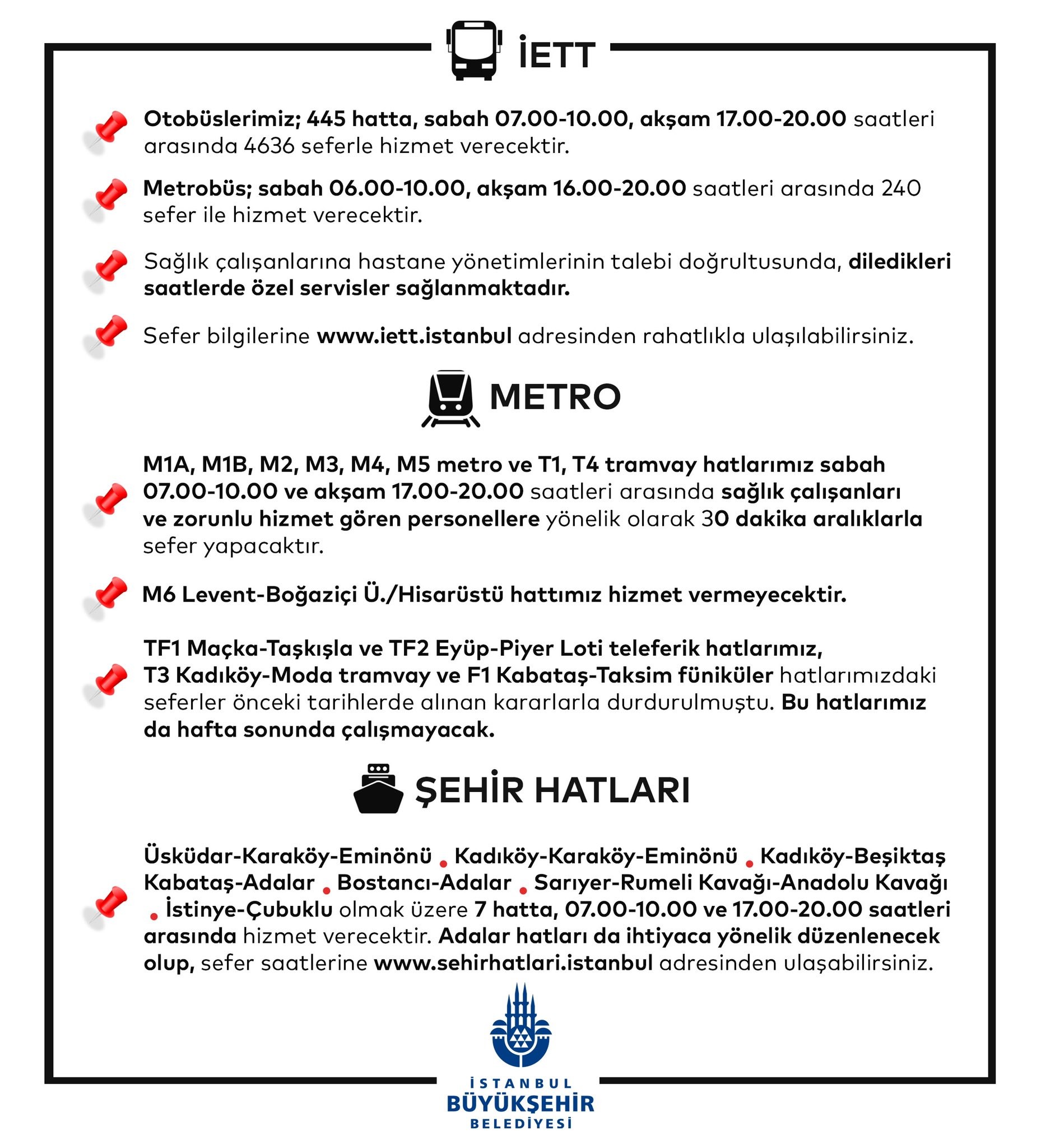 30 büyük şehir ve Zonguldak’ta toplu taşıma araçları belirli saat aralığında çalışacak. İstanbul’da toplu ulaşım saatleri şöyle: