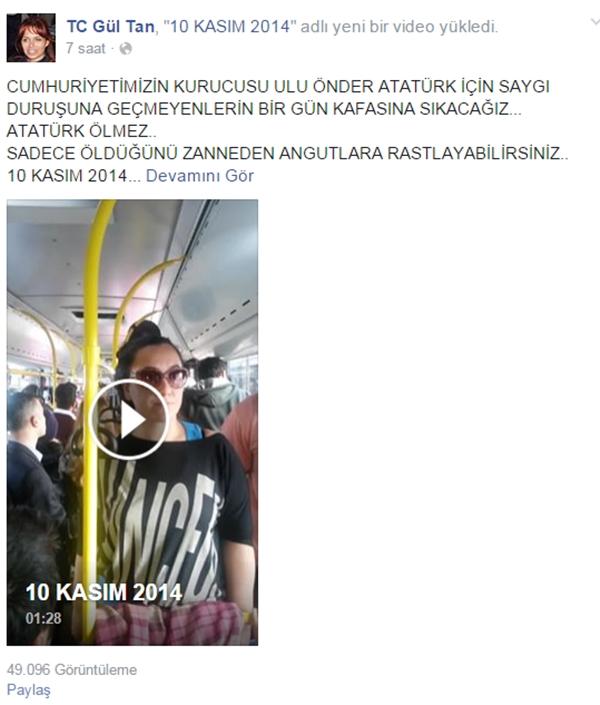 Tan, belediye otobüsündeyken sirenler çalmaya başlayınca ayağa kalktı. Ancak otobüste ayağa kalkmayanlar vardı. Duruma hazmedemeyen Gül Tan, "Cumhuriyetimizin kurucusu ulu önder Atatürk için saygı duruşuna geçmeyenlerin bir gün kafasına sıkacağız" diye bağırdı.