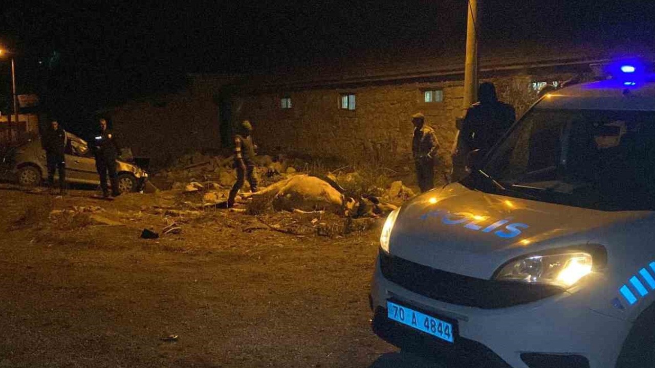 Karaman’ın Larende Mahallesi Kılbasan yolunda meydana gelen kazada, Ertuğrul Ş. (21) yönetimindeki 70 FN 006 plakalı Peugeot marka otomobil, yola çıkan ineğe çarpınca, çarpmanın etkisiyle inek telef oldu. Otomobilde bulunan sürücü Ertuğrul Ş. ile yolcular Emine Ş. (48), Cennet Hümeyra Ş. (11), Yiğit Ç. (15) ve Rabia Ç. (17) yaralandı.