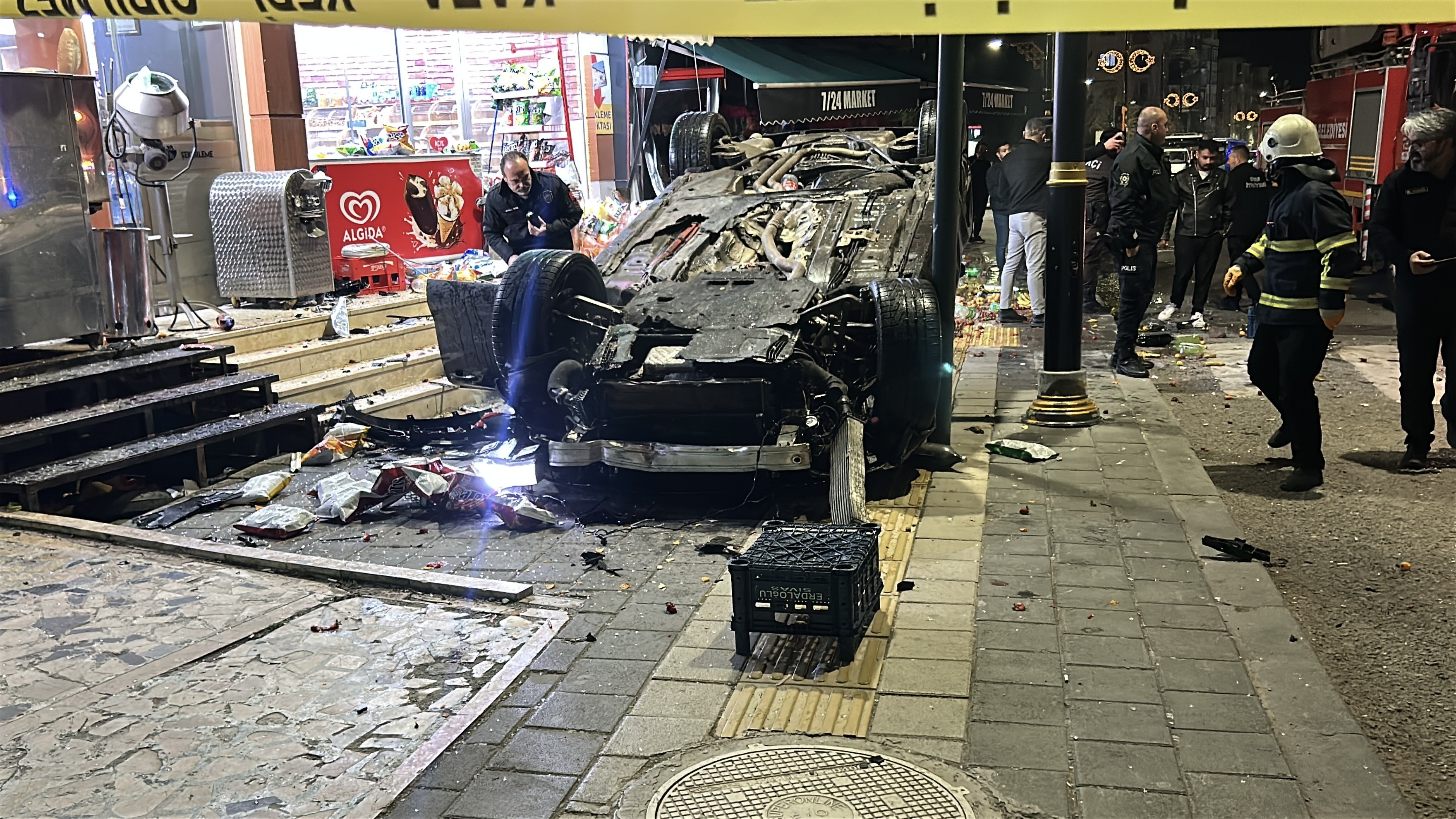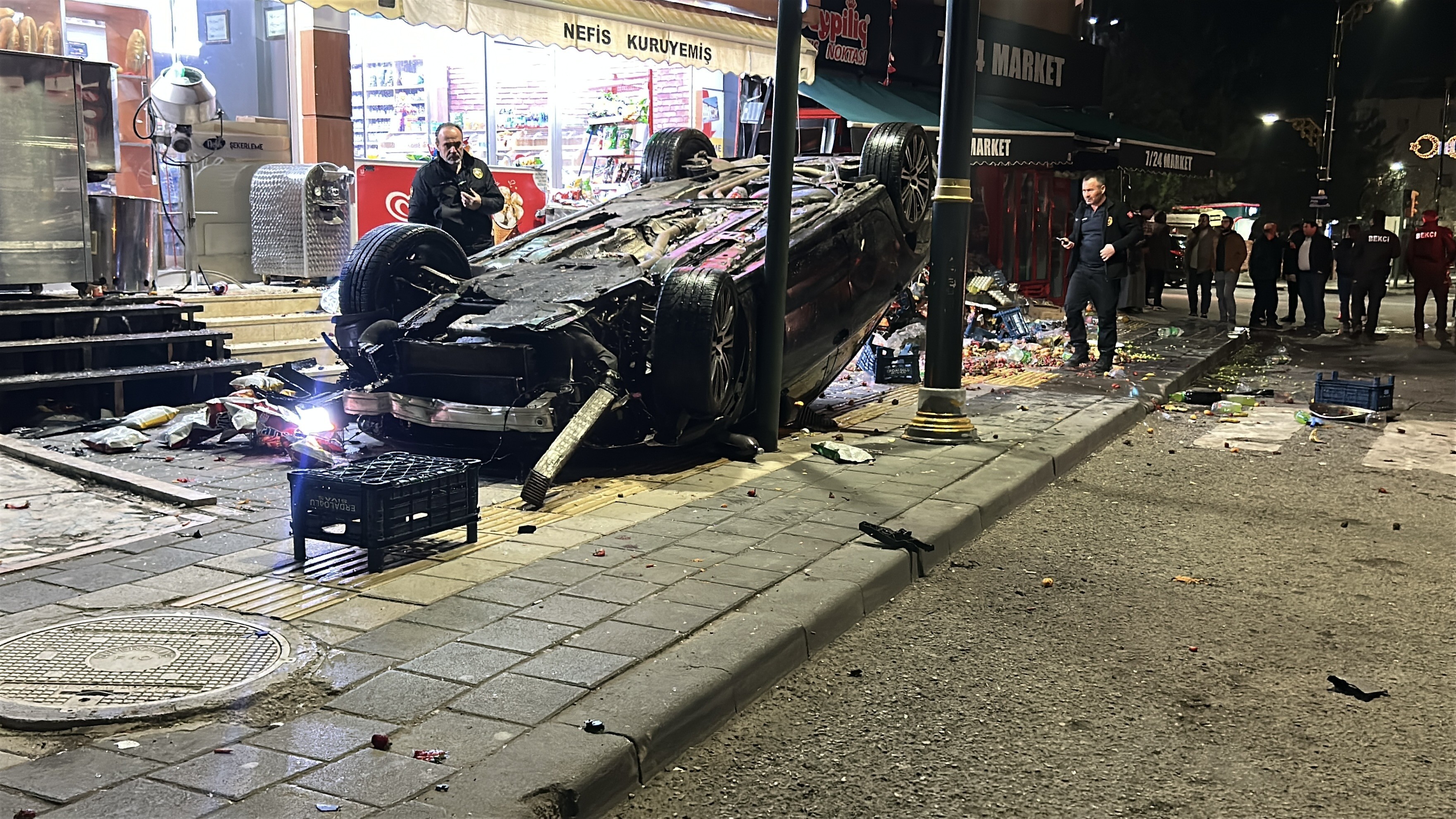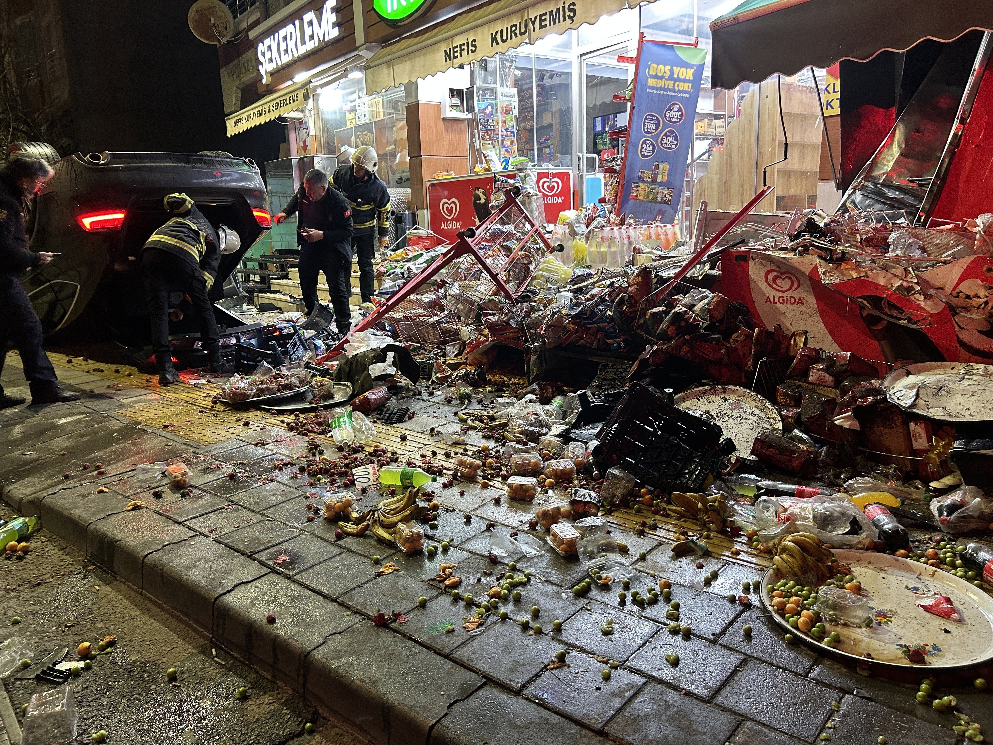 Edinilen bilgilere göre, Y.E.D. idaresindeki 58 ER 603 plakalı otomobil, önce markete ardından kuruyemiş dükkânına çarptı. Çarpmanın etkisiyle savrulan araç, kaldırım üzerinde devrildi.
