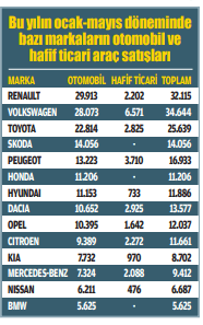 Türkiye’de otomobil ve hafif ticari araç satışları, ocak-mayıs döneminde 314 bin 882’ye ulaştı. Bu dönemde otomobil satışları yüzde 69.2 ve hafif ticari araç satışları yüzde 83 artış kaydetti. Toplam pazarda geçen yılın 5 ayında 183 bin 95 adet satış yapılmıştı.