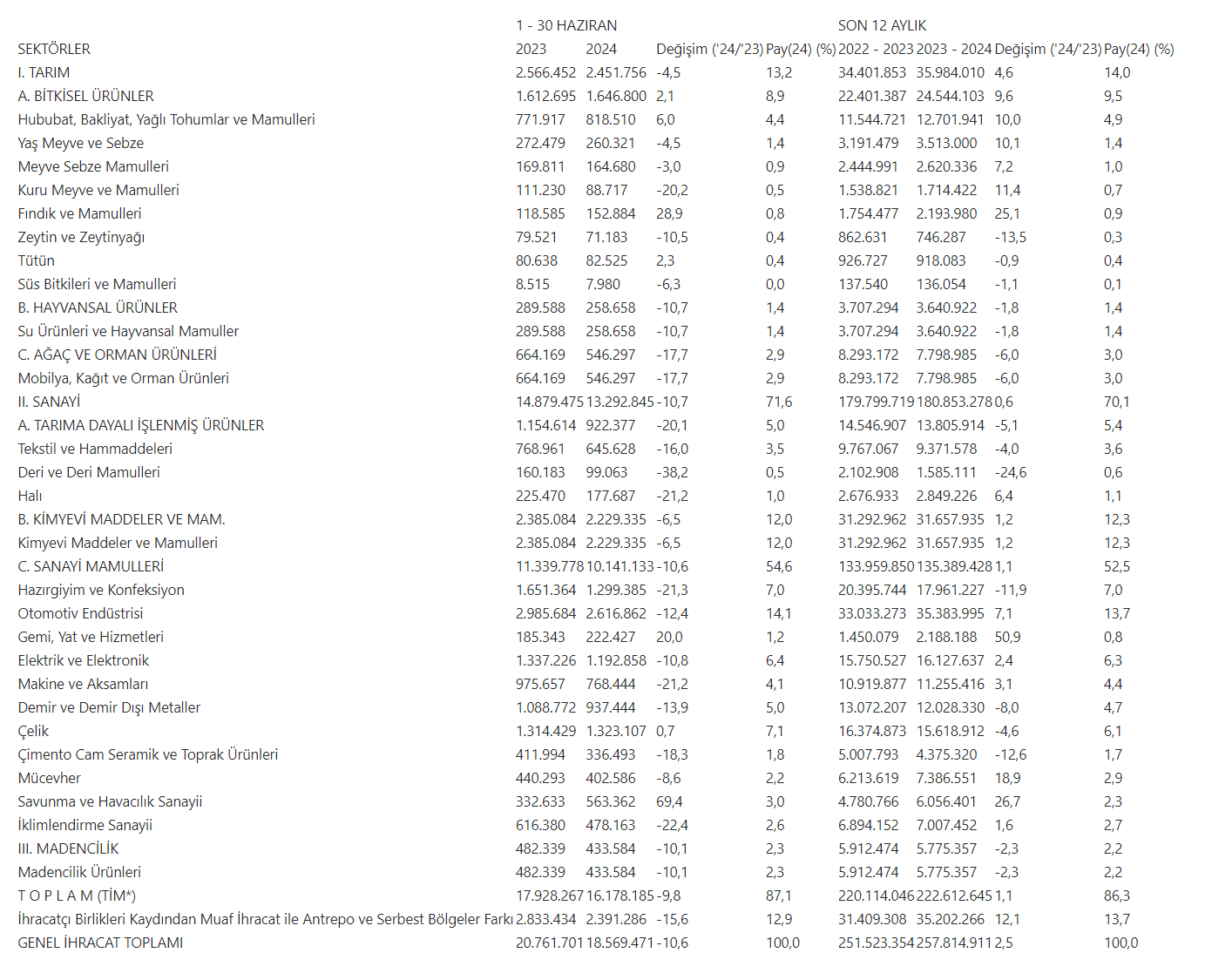 Haziranda ihracatın 13,2'sini oluşturan tarım grubunda yüzde 4,5'lik düşüşle 2,5 milyar dolarlık, ihracatın yüzde 2,3'ünü oluşturan madencilik grubunda ise yüzde 10,1'lik azalışla 433,6 milyon dolarlık dış satım yapıldı.