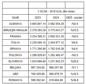 Otomotiv endüstrisinde en fazla ihracat 3,6 milyar dolarla Almanya'ya yapılırken, bu ülkeyi 3,2 milyar dolarla Birleşik Krallık, 3 milyar dolarla Fransa, 2,5 milyar dolarla İtalya ve 1,8 milyar dolarla İspanya takip etti.Birleşik Krallık ihracat artışında zirvede yer aldı. Ocak-eylül döneminde otomotiv sektörünün ülkeye dış satımı 796,7 milyon dolar arttı. İhracat artışında bu ülkeyi 220,4 milyon dolarla Romanya, 220 milyon dolarla İtalya, 212,9 milyon dolarla Slovenya, 125,6 milyon dolarla ABD izledi. Otomotiv endüstrisi, Slovenya'ya 1,2 milyar dolarlık, ABD'ye 886 milyon dolarlık, Romanya'ya 819,7 milyon dolarlık ihracat yaptı.