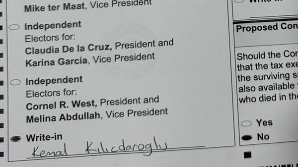 ABD'deki başkanlık seçimleri tüm hızıyla devam ederken, ilginç bir olay yaşandı. Virginia eyaletinden CHP Eski Genel Başkanı Kemal Kılıçdaroğlu'na oy çıktı.