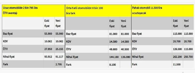 Şu anda piyasada satılan en ucuz otomobillerden birisi olan ve 93 bin 900 liraya satılan otomobilin ÖTV'si yeni düzenleme ile 27 bin 950 liradan 25 bin 155 liraya inecek. Yani vergi 2 bin 795 lira daha az ödenecek. Otomobilin satış fiyatı da bu gelişme sonucunda 91 bin 117 liraya düşmüş olacak.