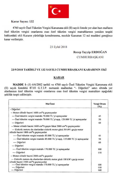 Cumhurbaşkanı Erdoğan’ın imzası ile yayımlanan kararda, 4760 sayılı Özel Tüketim Vergisi Kanunu kapsamında yer alan bazı malların ÖTV matrah (vergisiz çıplak fiyat) limitlerinin yeniden tespit edildiği belirtildi. Buna göre, motor silindir hacmi 1600 cc ve altı araçlar için ÖTV matrahının alt limiti yüzde 52 artışla 46 bin TL’den 70 bin TL’ye, üst limiti ise yüzde 50 artışla 80 bin TL’den 120 bin TL’ye yükseltildi. Matrahı 70 bin TL’yi aşmayan araçlar için ÖTV yüzde 45 (Eski rakam 46 bin TL), 70 bin lirayı aşıp 120 bin lirayı aşmayanların yüzde 50 (Eski rakam 80 bin TL), matrahı 120 bin TL’yi aşan 1.6 litre ve altı araçlarda ise ÖTV yüzde 60 olacak şekilde belirlendi.