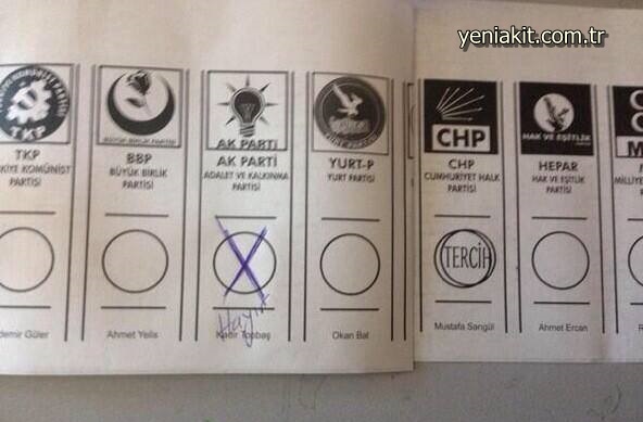 Oy verdiği partiye "tercih" mührünü basan bazı seçmenler, karşıt görüşteki bir partinin ambleminin altına ise tükenmez kalemle çarpı işareti atıp "hayır" ifadesini yazarak oylarını geçersiz kıldılar.