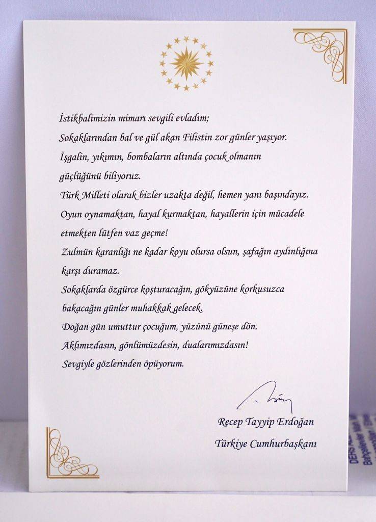 Filistinli çocuklar için yola çıkan “Benim Oyun Sandığım” eğitim seti sandıkların içinde Cumhurbaşkanı Recep Tayyip Erdoğan’ın Filistinli çocuklara mesajı da yer alırken, Erdoğan, mesajında, “Türk Milleti olarak bizler uzakta değil, hemen yanı başınızdayız. Oyun oynamaktan, hayal kurmaktan, hayallerin için mücadele etmekten lütfen vazgeçme! Zulmün karanlığı ne kadar koyu olursa olsun, şafağın aydınlığına karşı duramaz. Sokaklarda özgürce koşturacağın, gökyüzüne korkusuzca bakacağın günler muhakkak gelecek. Doğan gün umuttur çocuğum, yüzünü güneşe dön. Aklımızdasın, gönlümüzdesin, dualarımızdasın. Sevgiyle gözlerinden öpüyorum.” ifadelerini kullandı.